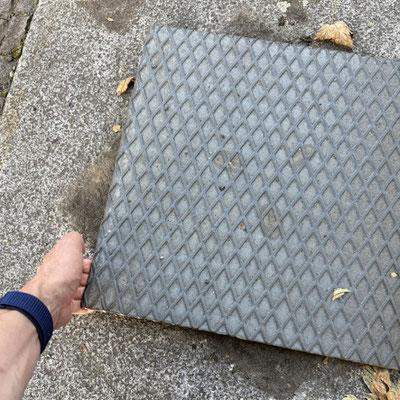 Zu meinem Erstaunen ist die Abdeckplatte ohne Fixierung, lässt sich leicht vom Pumpenschacht anheben und gibt sogar den Blick auf das noch tief unten vorhandene Nass frei.