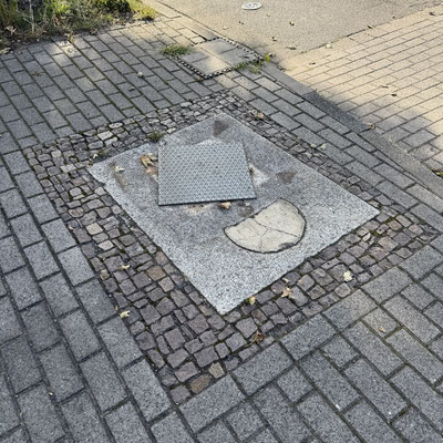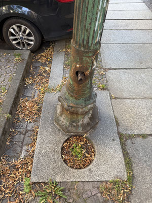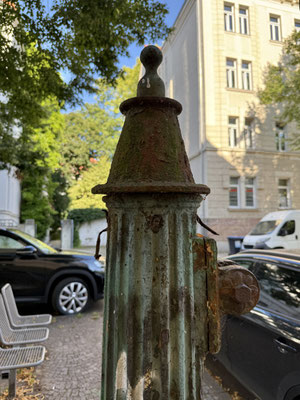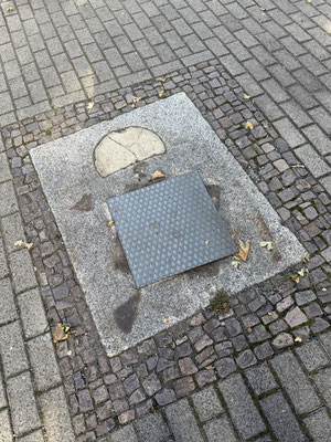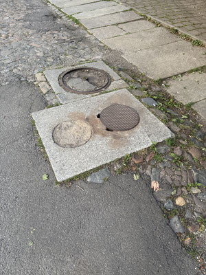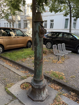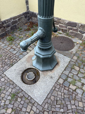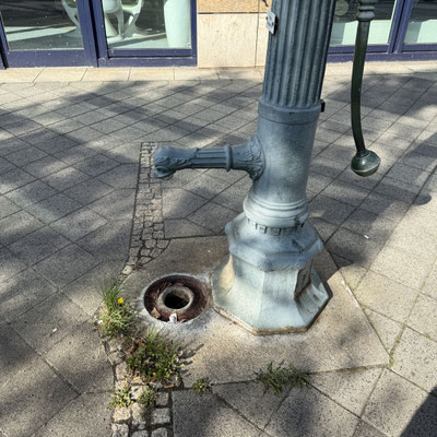 ...Nun (19.09.2023) ist am ehemaligen Standort der Handschwengelpumpe der Rest gänzlich verschwunden. Nur noch eine kleine Abdeckplatte im Gehwegbereich nähe Bordsteinkante läßt, so denke ich, erahnen, wo einst die Pumpe stand.