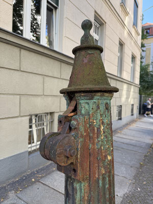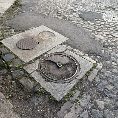 Bei diesem Zeugnis eines ehemaligen Pumpenstandortes in der Friedrichstraße (zugegeben eine Straße; Parallelstraße zur Brüderstraße; die ich in meinem Leben bis dato noch nie betreten hatte) handelt es sich um eine steinerne Bodenplatte, einen Brunnenschacht mit Abdeckplatte, sowie einen danebenliegenden Wartungsschacht.