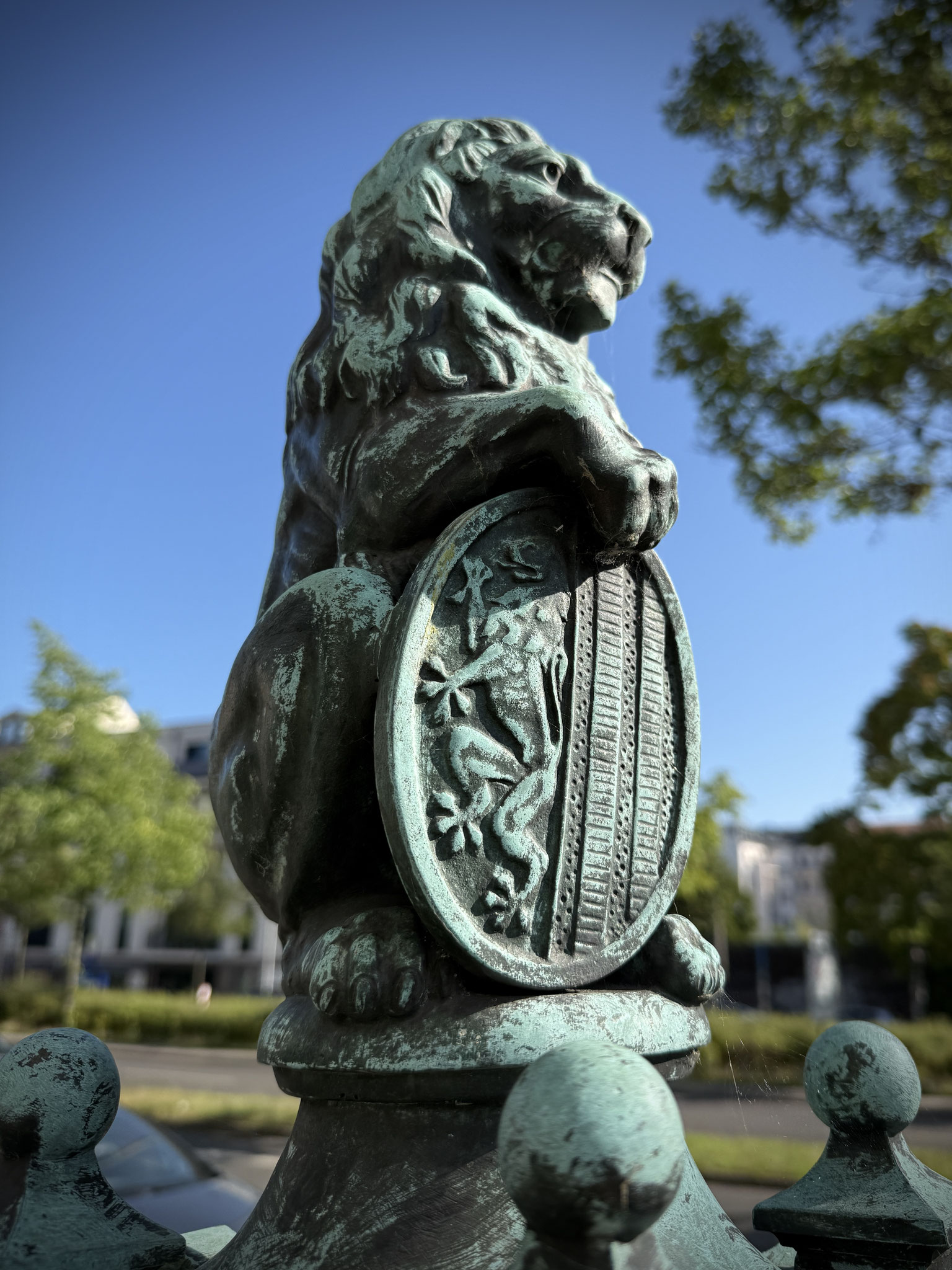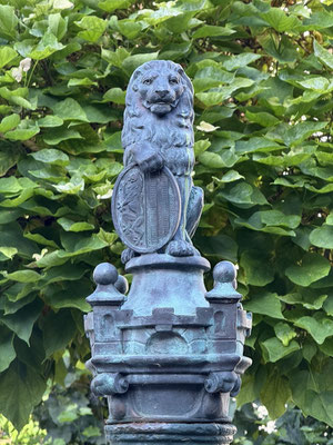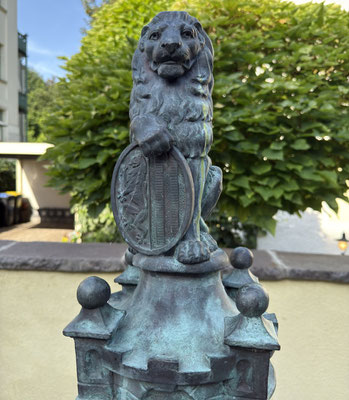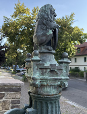 Besonders schmuckvoll ist bei den Handschwengelpumpen des Typs "kleiner Löwe", das, wie der Name schon sagt, kleine Wappentier der Stadt, der Löwe der aufgerichtet sitzend das Stadtwappen in seinen Klauen hält.