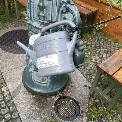 An ihr hängt eine Gießkanne, die man über die App der Initiative "Leipzig gießt" quasi "freischalten" kann, um sie mit dem Wasser der Handschwengelpumpe zur Bewässerung des Stadtgrüns nutzen zu können. Die Umsetzung einer klasse Idee, die ich schon einmal an einer Handschwengelpumpe entdecken konnte.