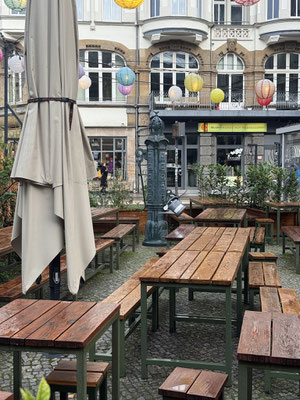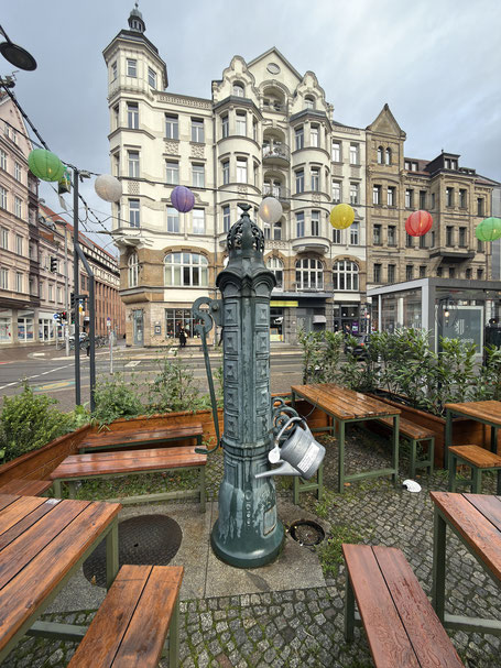Obgleich diese Handschwengelpumpe Typ Vogelkäfig -markiert mit der Nummer 35- in einem Freisitz eines Speisenlokals integriert ist, zieht sie dennoch am Peterssteinweg in Ecklage Münzgasse die Blicke auf sich.