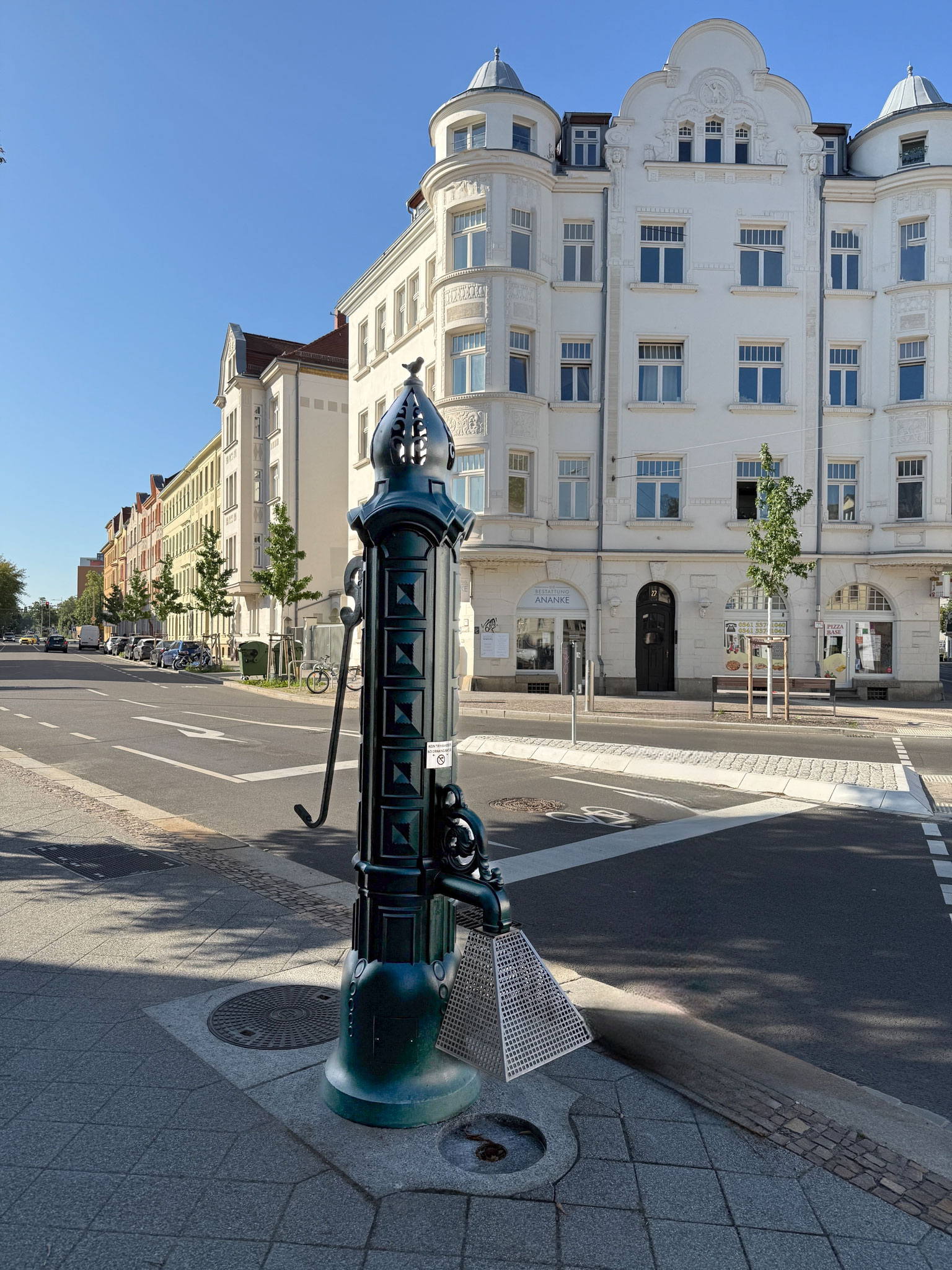 Quasi hinter der Eutritzscher Dorfkirche, befindet sich in der Gräfestraße diese restaurierte Handschwengelpumpe, die sich in besonders gutem Zustand befindet (Stand 08/2025).