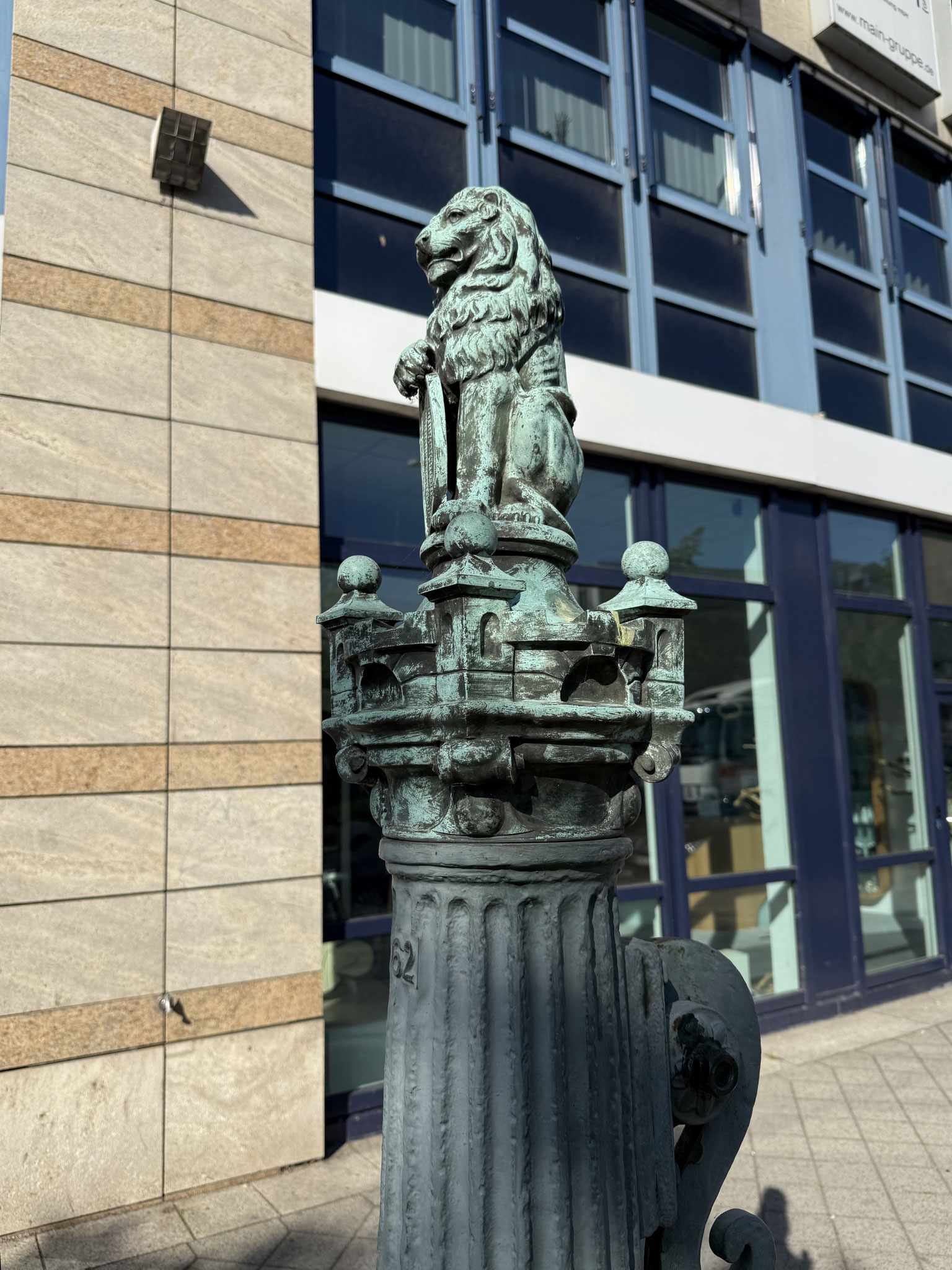 Eine restaurierte Handschwengelpumpe mit dem schmuckvollen Löwendetail, die sogar funktionsfähig Wasser spendet, befindet in unmittelbarer Nähe zur Toreinfahrt Universitätsstraße des sog. "Städischen Kaufhauses".
