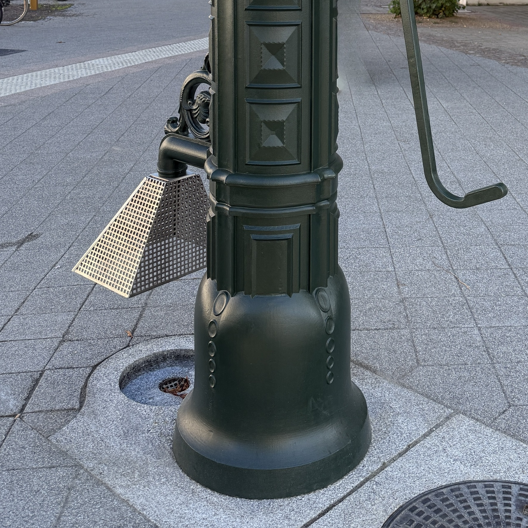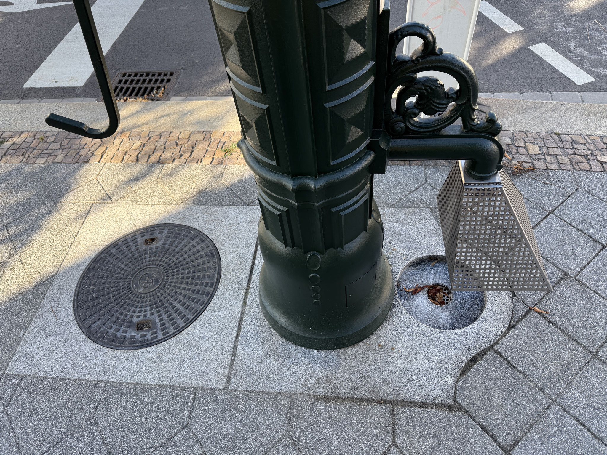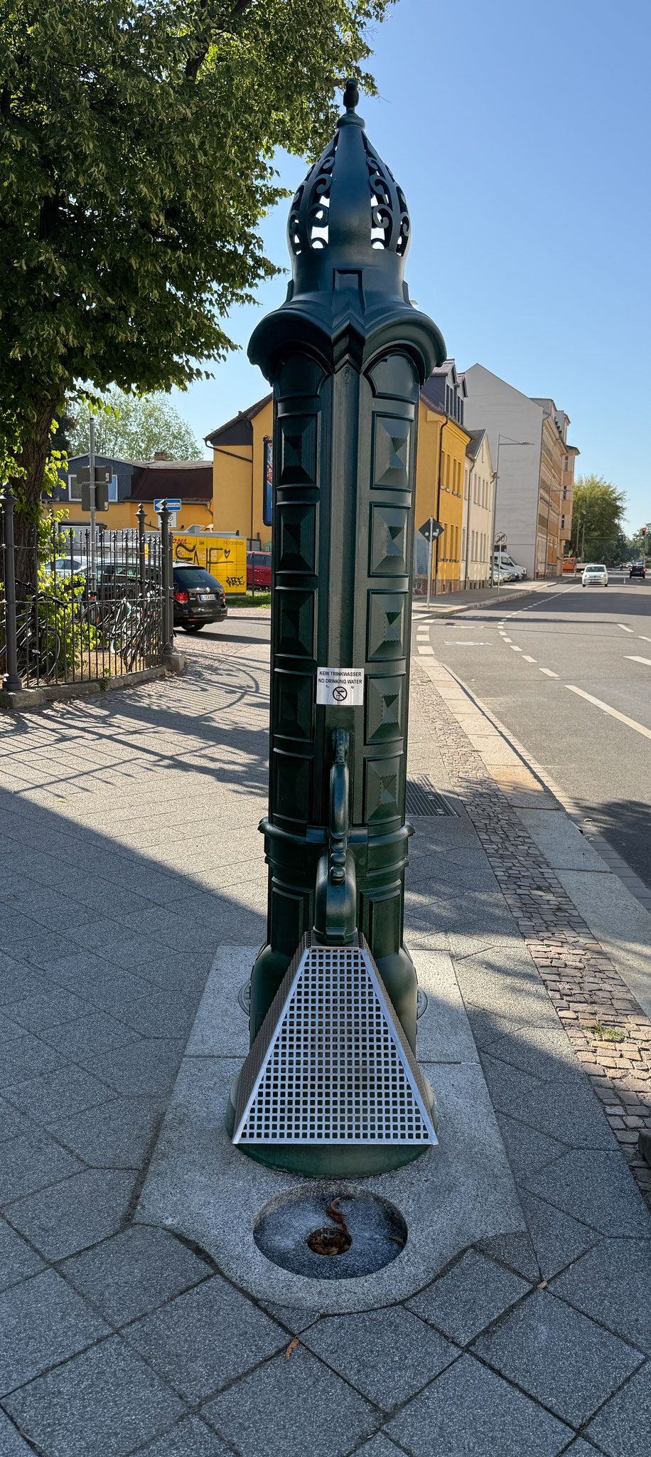 Trinkwassernetz angeschlossen. Damit aus der Pumpe Wasser strudelt, was natürlich gern zur Bewässerung der Straßenbäume verwendet werden darf, wurde ein extra Brunnen gebohrt.